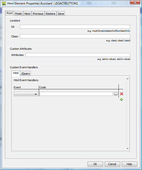 As the Html Element Properties Assistant explains, events Bubble up the DOM, so Event Handlers added to the Root element will respond to events generated in the rest of the Control, including events from the buttons (because this element surrounds it). For example if an onclick Html Event Handler has been added to the Root element then it will be run whenever a User clicks the Finish button. If an Event Handler is configured for the Add Row Button, in any columns, then code in those Event Handlers will run first, followed by the code in the Root Handler.
