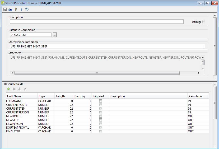 The following example shows a Stored Procedure Resource named FIND_APPROVER which has been imported from an Oracle database and has 4 IN parameters and 5 OUT parameters.